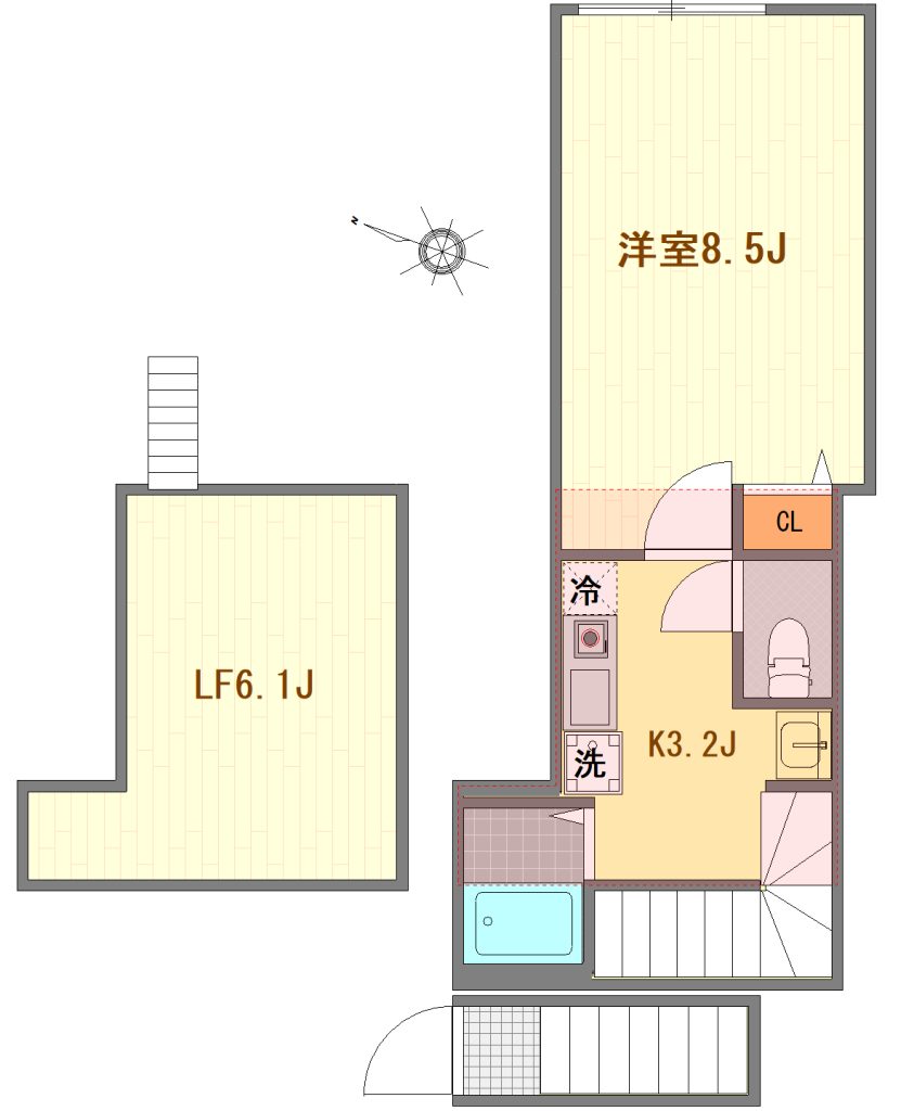- バストイレ別・浴室換気乾燥機・温水洗浄便座・独立洗面台・IHコンロ(1口)・モニターホン・エアコン・クローゼット・宅配BOX・防犯カメラ・インターネット無料(建物全体で1Gbps)・2Fロフト付き